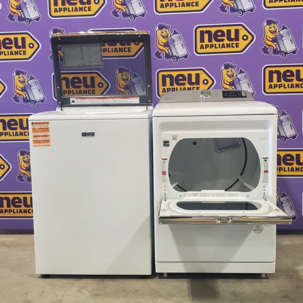 Maytag White Smart Top Load 5.2 Cu. Ft. Washer with Extra Power Button MVW7230HW – Scratch and Dent (Minor) and Maytag White Smart Gas 7.4 Cu. Ft. Dryer with Extra Power Button MGD7230HW – Open Box